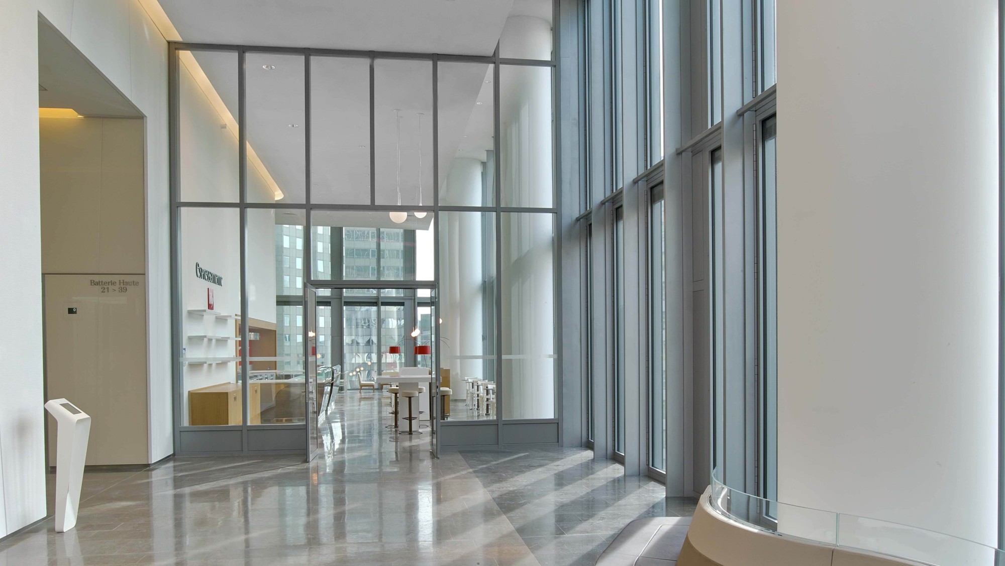 The Tour Majunga was under construction at the time of our involvement, which is always a challenge : first for accessibility reasons, but also as we were providing finishes amidst the structural work. The High-Rise Building Regulation also presented its own challenges, e.g. in terms of choice of layouts and materials (fire resistance and fire load). Quadrilatère supported the project over the long term, first on the development of the communal areas, then on the development and creation of the two successive showcase areas, all designed by Saguez & Partners.