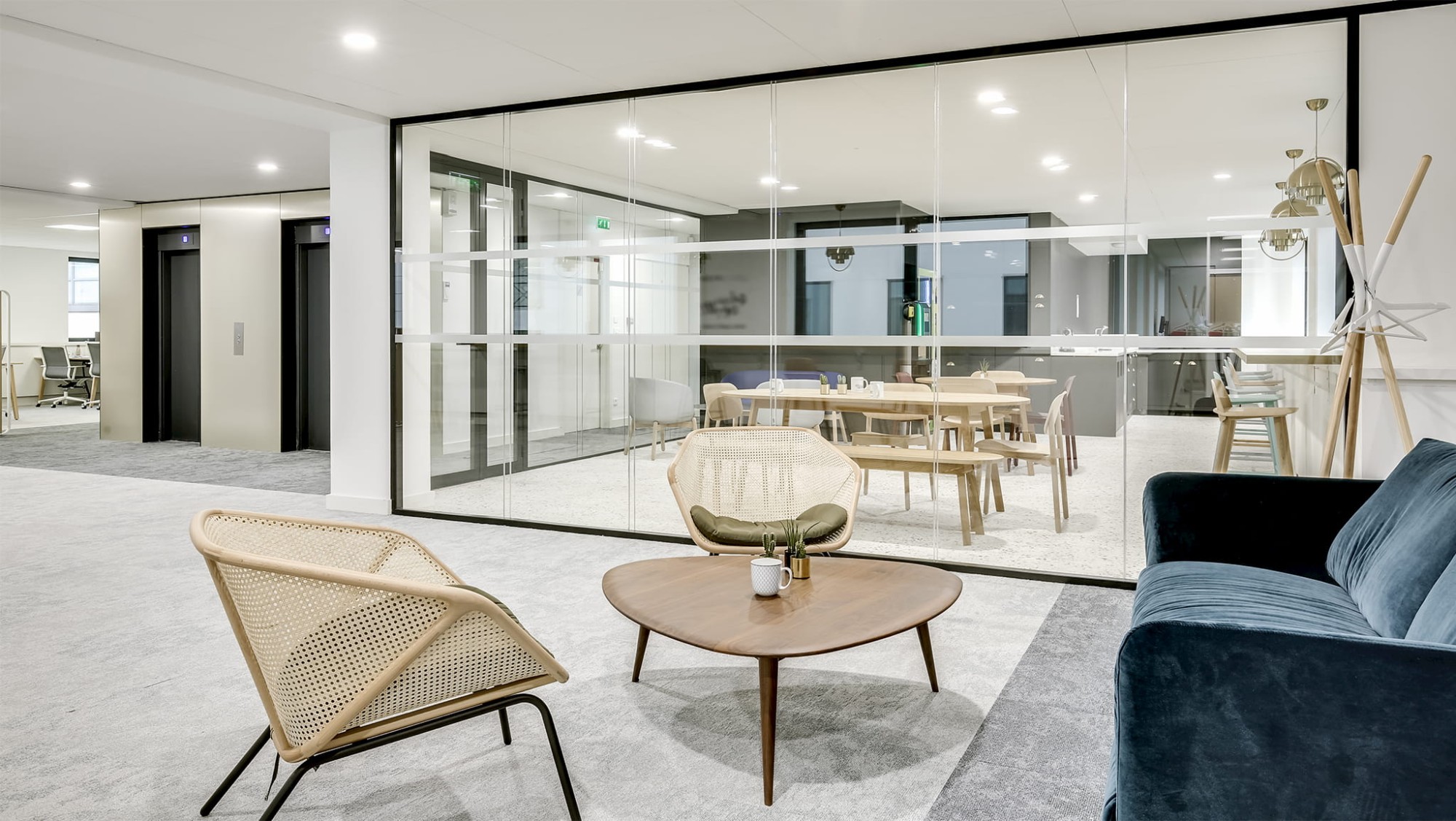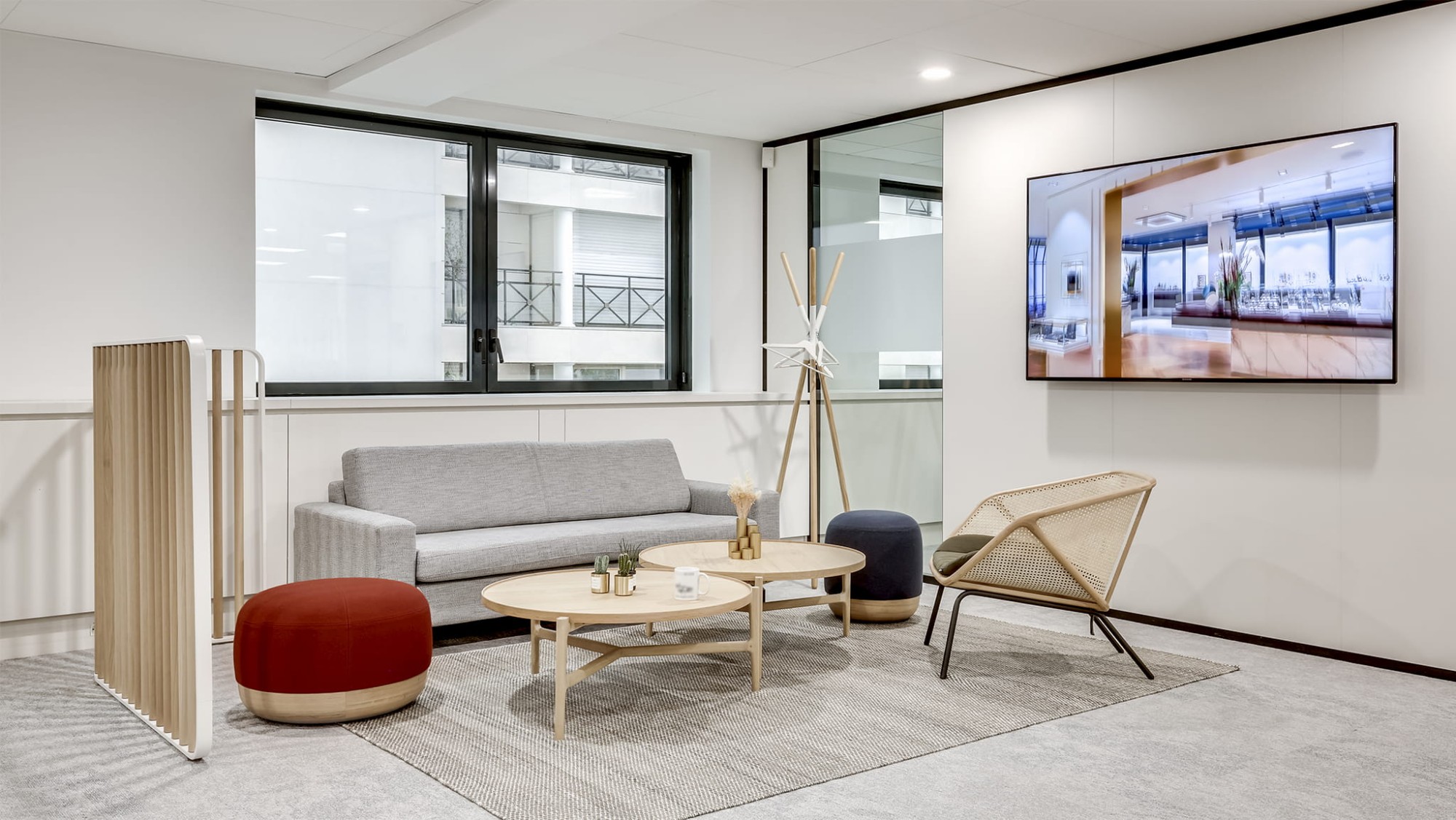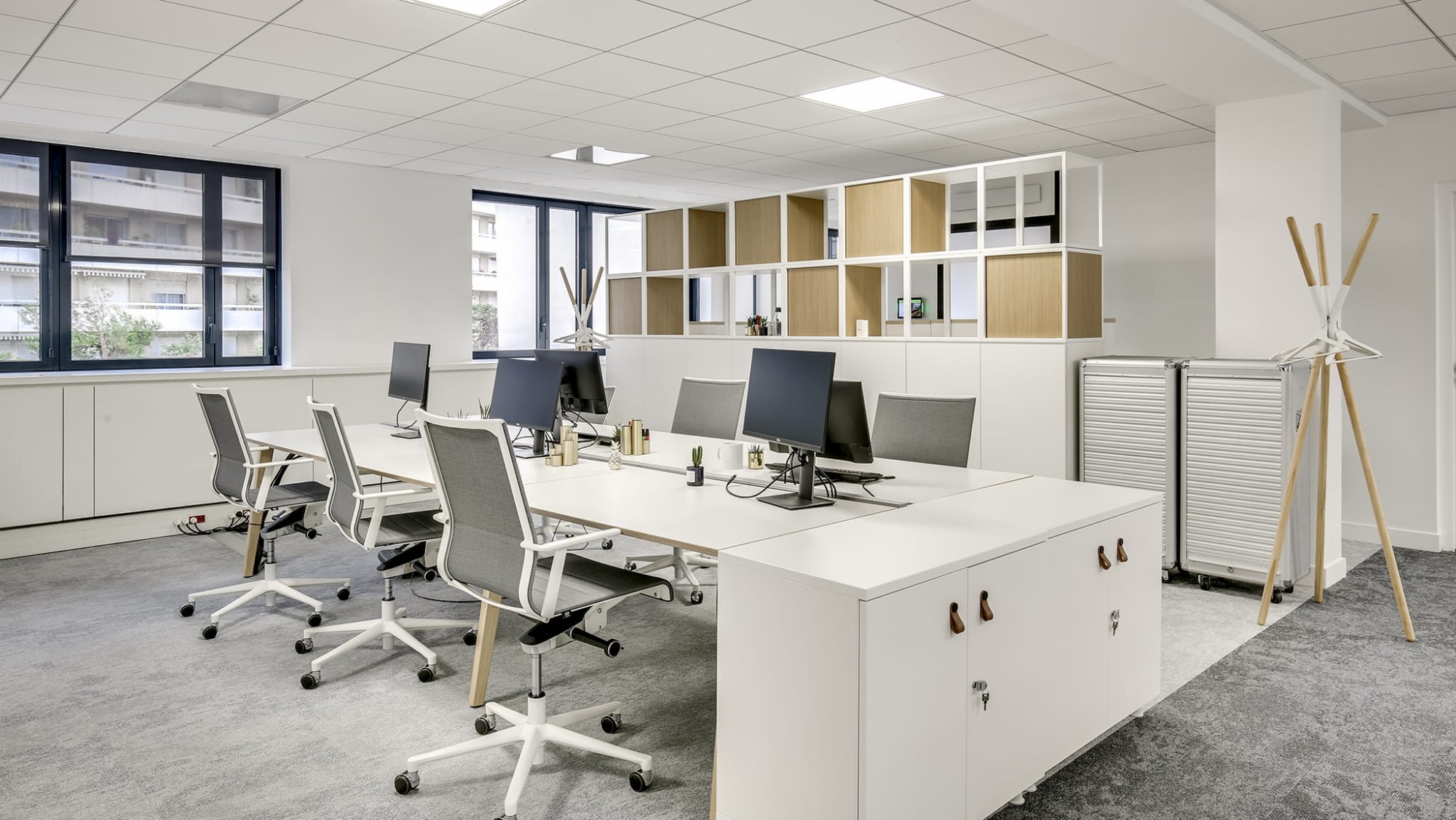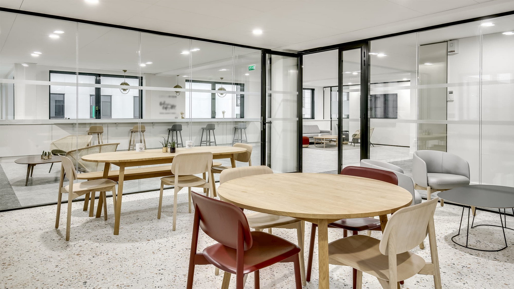 Large-scale technical works have been performed on the HVAC system. In fact, the building is fitted with convection fans placed on apron walls. This complex installation process was overseen by our engineering office, which designed the necessary partitions in an eye-pleasing style, while maintaining acoustic properties. Finally, the absence of a raised floor required the electrical cables to be routed around the edges, in raceways or via the suspended ceiling. Nonetheless, the low plenum was restrictive, and the suspended ceiling had to be completely removed at some points.
