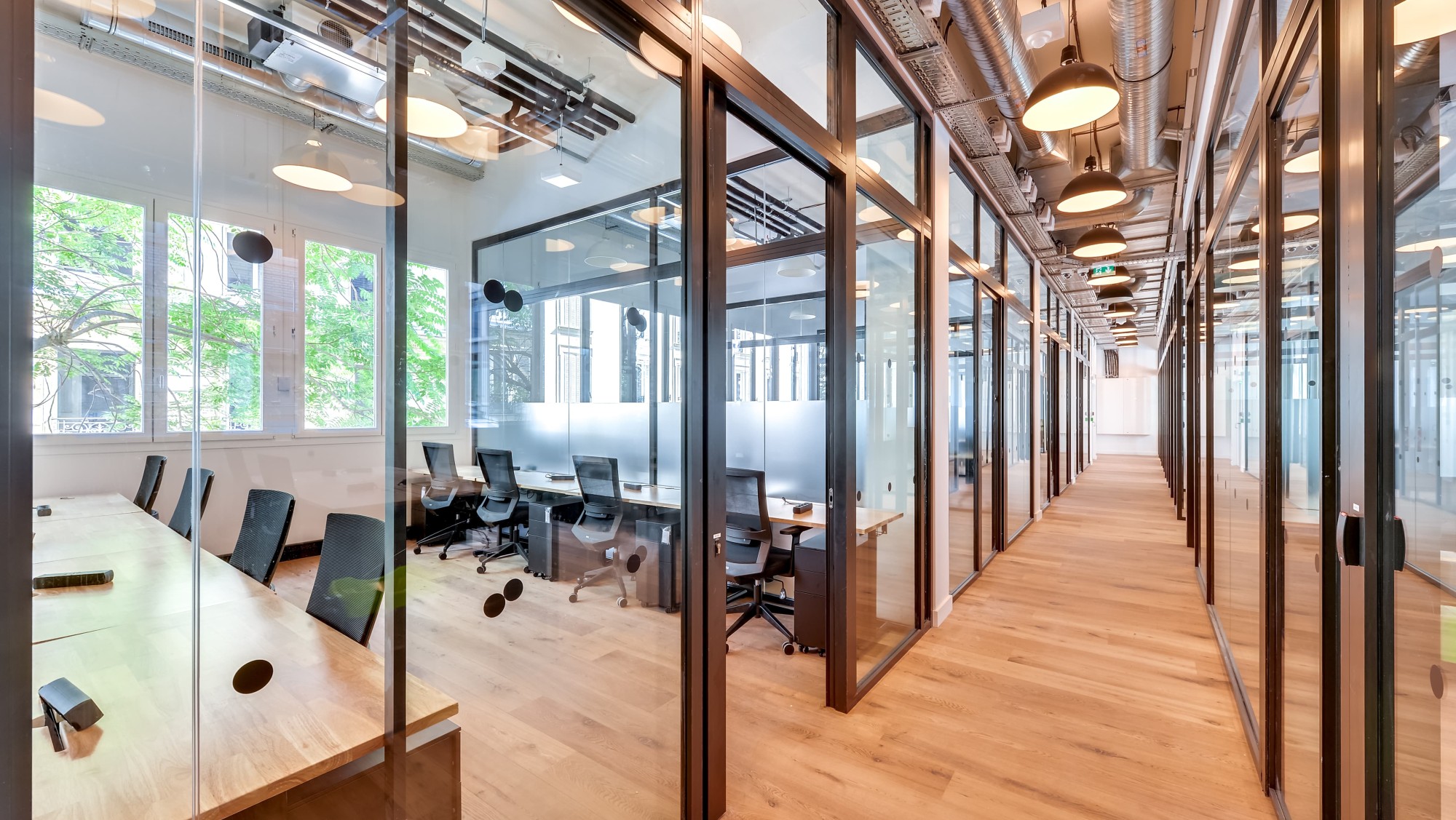 The second challenge was compacting the spaces as the workforce in the building has more than doubled. We added several staircases: two in Chambord (interwoven with the exterior), a small one inside (between the ground and first floors), and another to the seventh-floor terrace. Finally, the car park and existing service areas in the upper basement were transformed into meeting and office spaces, whilst the volumes were redesigned in the hall with a mezzanine floor demolished.