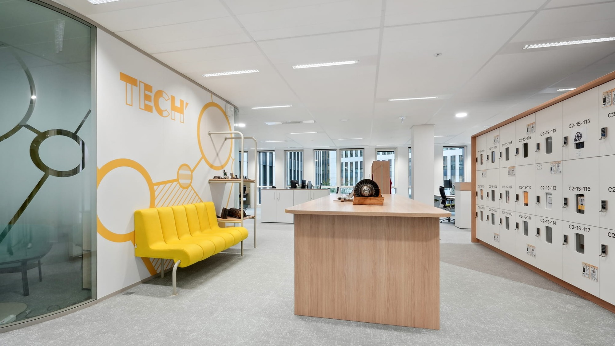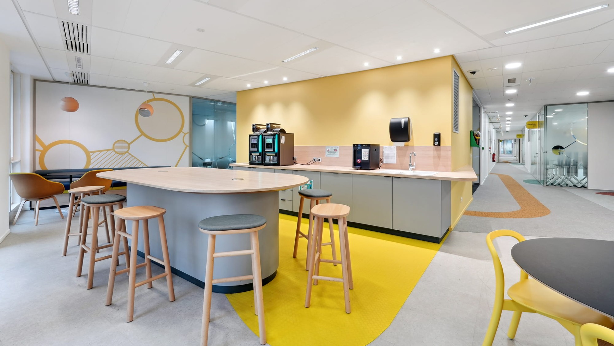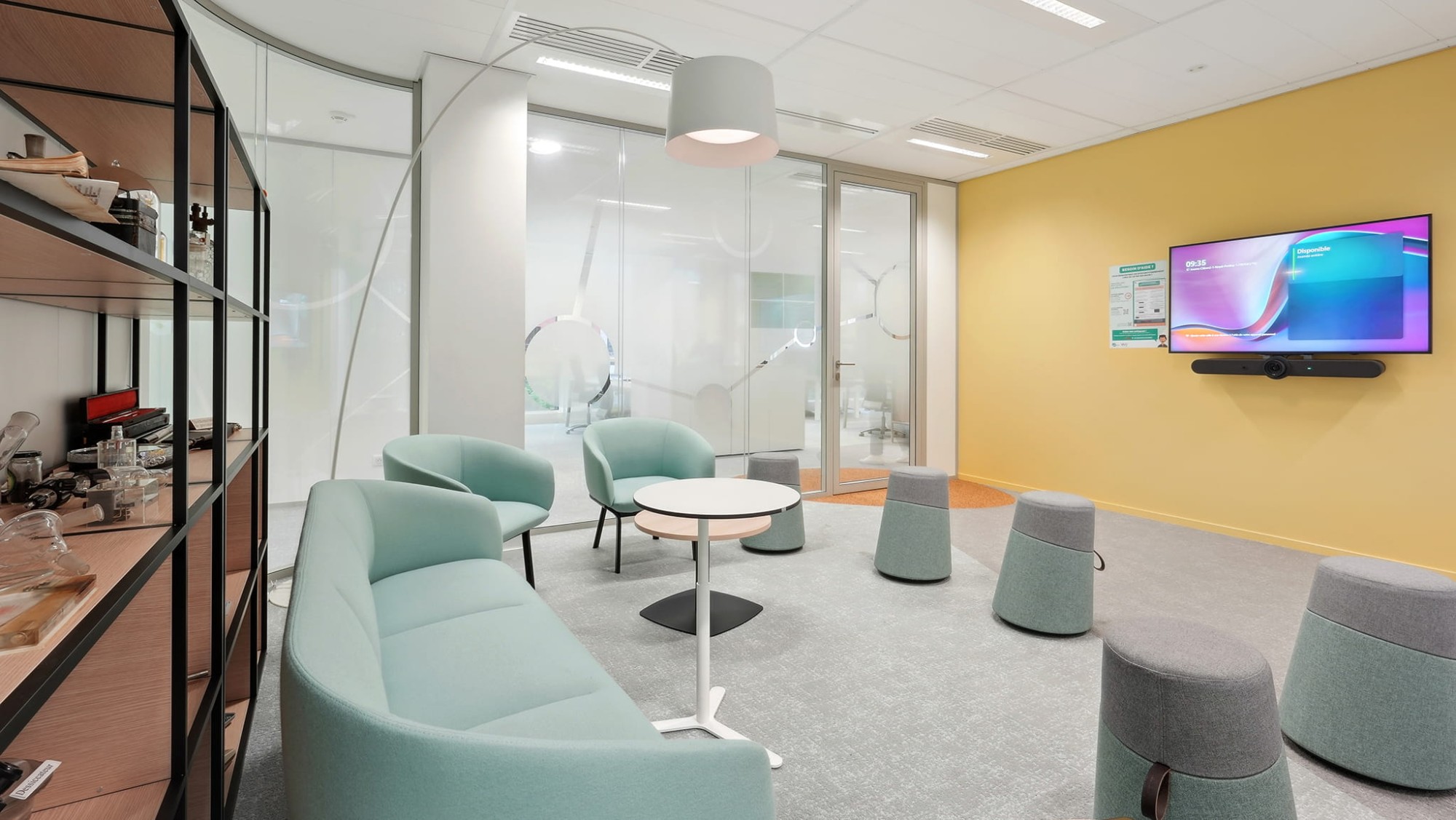 - l’agencement : le projet comporte beaucoup d’éléments agencés réalisés sur-mesure : potences lumineuses, étagères, grande table de la cafétéria, banquettes, mobilier inter-bench (tableau Velléda, porte-manteaux sur roulettes, bibliothèques, tablettes, casiers sur-mesure)