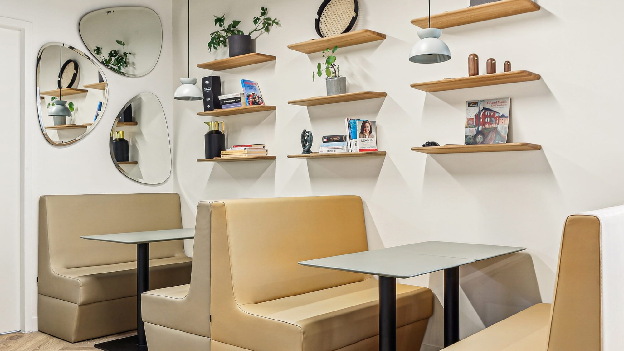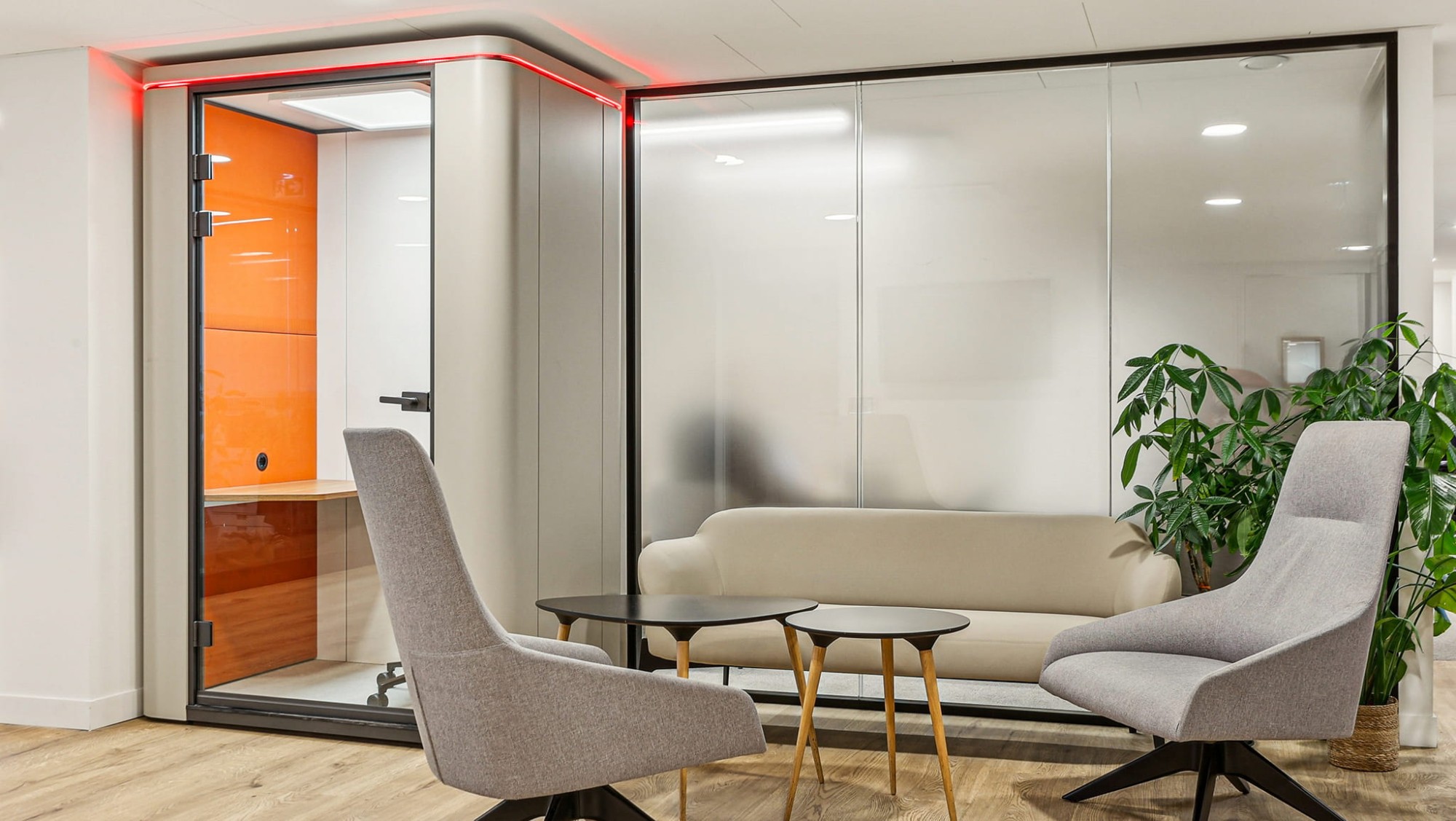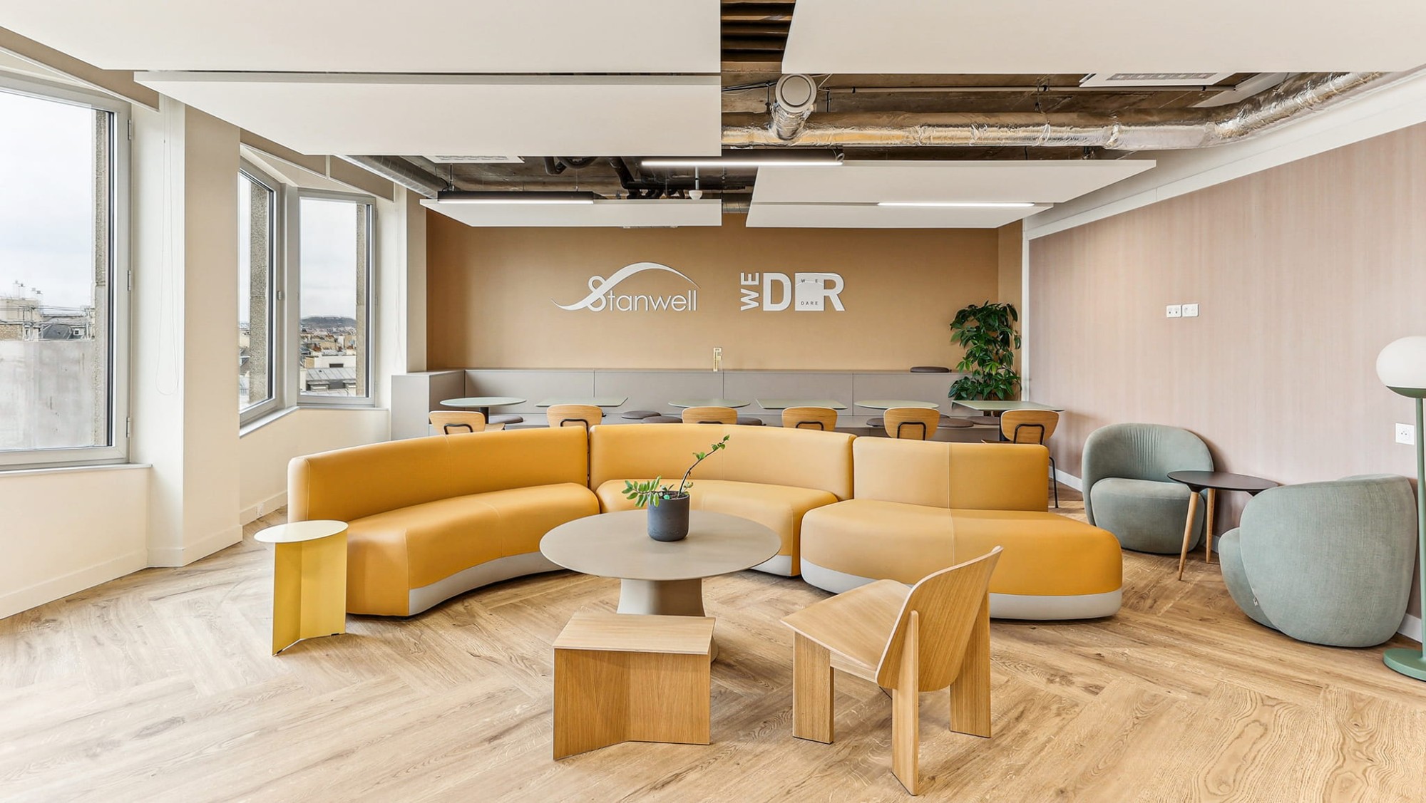 Côté design, les mots d’ordre étaient : nature / chaleur / convivialité. C’est chose faite, grâce à la présence du bois, des formes rondes et du camaïeu de couleurs orangées qui font écho à la charte graphique de Stanwell Consulting.