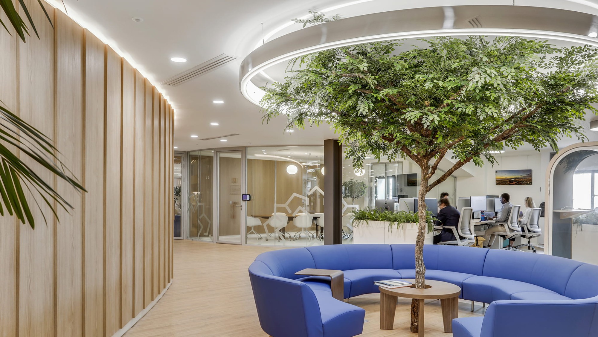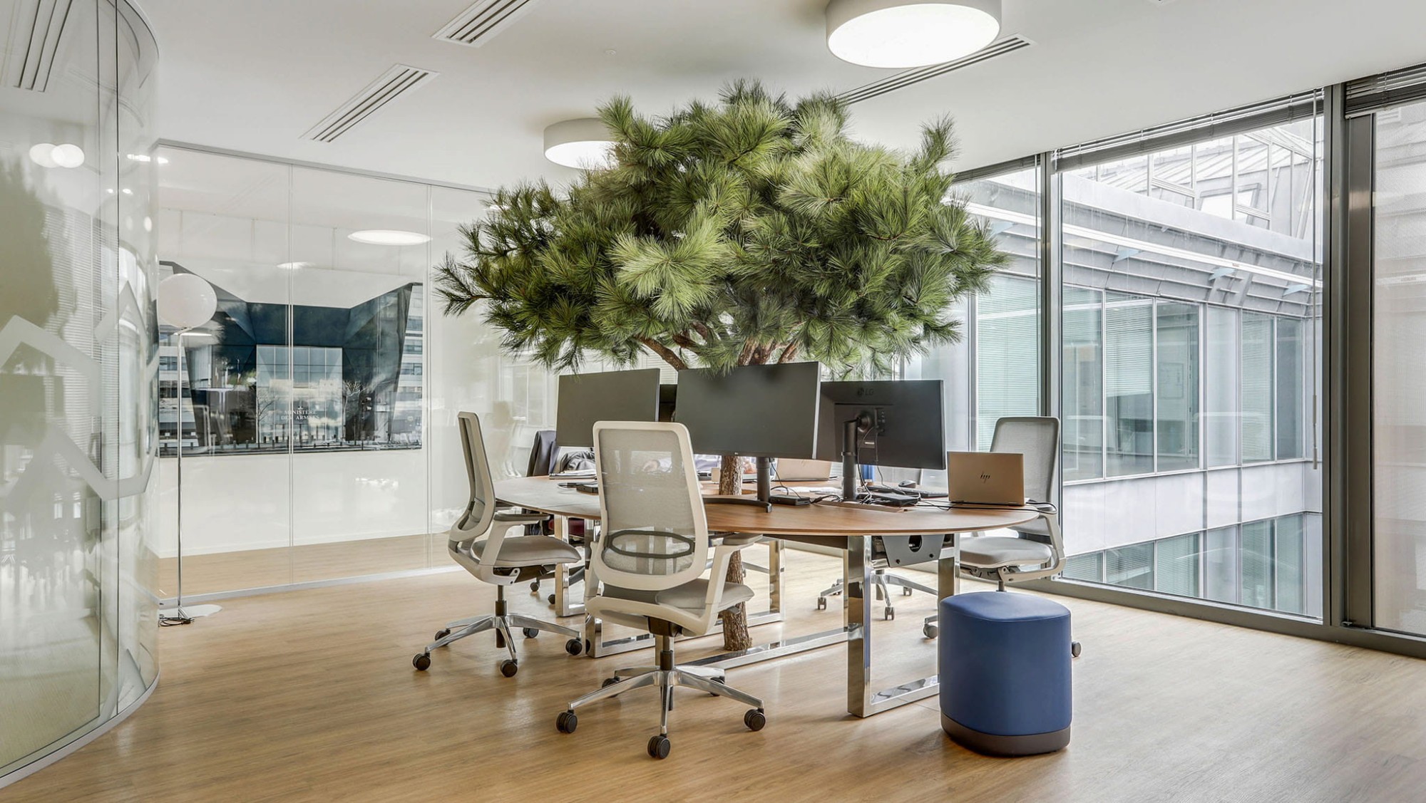 Côté mobilier, l’ergonomie et le confort sont au rendez-vous : tous les fauteuils de travail ont été remplacés, tous les postes de travail sont désormais réglables en hauteur. Trois arbres stabilisés ont été intégrés pour apporter de la verdure, complétant ainsi les bouts de bench végétalisés.